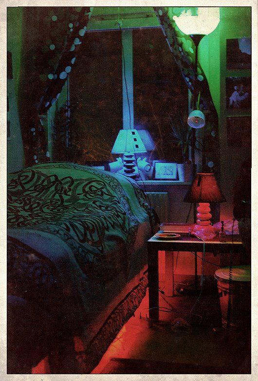 By the way, the colors of the picture are actually accurate. This due to the colorful lighting in my room, which I've spent alot of time and money on to get right. I'll add a picture of my bedroom below. Note, if you will, that the big floor lamp that's kind of green in this picture actually changes between 768 different colors, and is usually set to blue or purple, and that my black light is not shown in the picture.